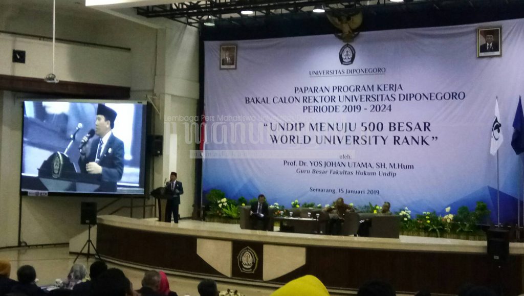 ManunggalCybernews—Bakal calon Rektor Undip menyampaikan Visi “Undip Menuju 500 Besar World University Rank” dalam acara “Paparan Program Kerja Bakal Calon Rektor Universitas Diponegoro Periode 2019-2024” pada Selasa (15/1), di gedung Prof. Soedarto, Undip Tembalang. Acara ini turut dihadiri oleh berbagai elemen seperti tim panelis, Majelis Wali Amanat Unsur Mahasiswa (MWA UM), civitas akademika, mahasiswa umum dan Ganjar Pranowo selaku Gubernur Jawa Tengah yang juga menjabat sebagai MWA Undip. Acara yang berlangsung sejak pukul 09.30 wib ini berupa penyampaian visi-misi, program kerja yang disampaikan oleh Prof. Yos Johan Utama selaku calon tunggal.