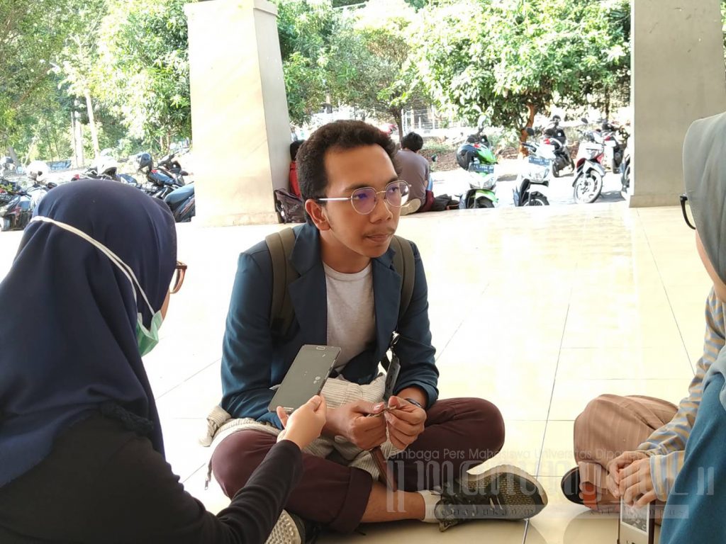 Ketua Panlih, Al Farrel Aprillyanto memberikan keterangan usai dibatalkannya Dialog Terbuka di Student Center Undip, Tembalang, Sabtu (16/11). (Juan/Manunggal)
