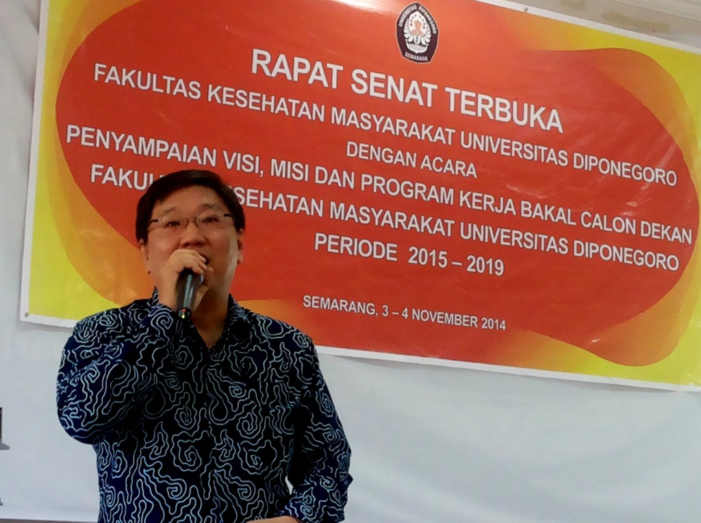 Henry Setyawan S Msc memoderatori Rapat Senat Terbuka yang beragendakan penyampaian visi, misi, dan program kerja Bakal Calon Dekan FKM di Gedung E FKM Undip, Senin (3/11). (Ririn/Manunggal)