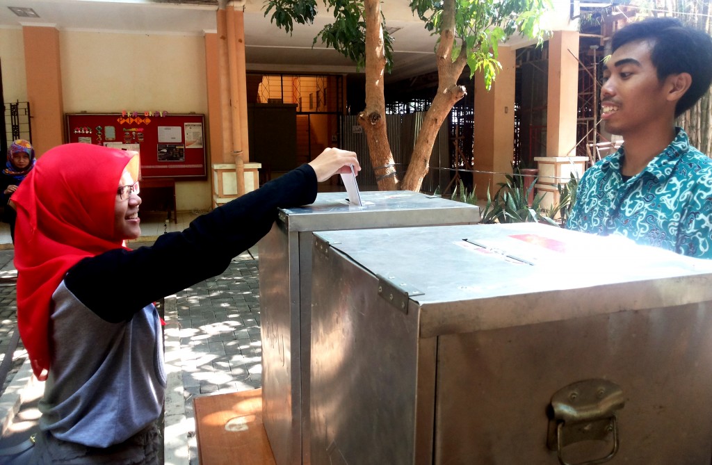 Salah satu mahasiswa Fakultas Kesehatan Masyarakat (FKM) Undip memasukkan surat suara usai mencoblos bakal calon dekannya di Halaman Gazebo FKM Undip, Rabu (5/11). (Ririn/Manunggal)