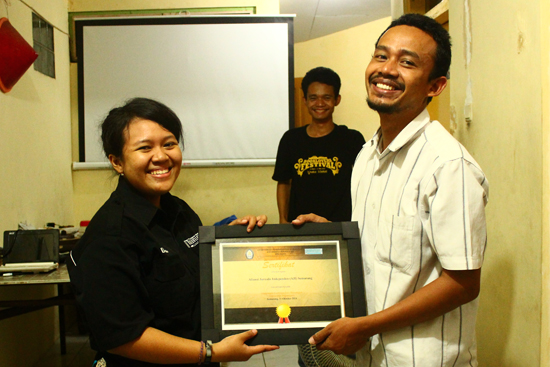 Pemimpin Umum LPM Manunggal, Dila Naharika, menyerahkan kenang-kenangan kepada Ketua AJI Semarang, Rofiudin, di akhir kunjungan LPM Manunggal ke Kantor AJI Semarang, Jumat (31/10). (Nina/Manunggal)
