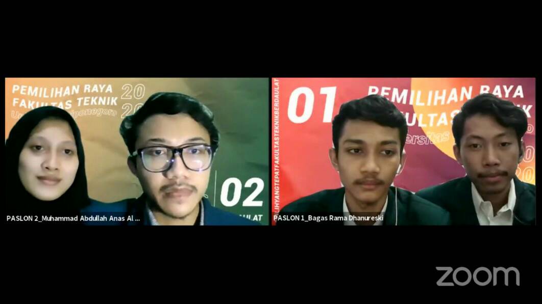 Warta Utama— Debat Terbuka I Pemira Fakultas Teknik (FT) Undip digelar, Jum’at (11/12) melalui Zoom. Acara tersebut mengangkat tema “Menganalisa Permasalahan, Potensi, dan Pengembangan Sumber Daya Manusia, Mahasisawa Fakultas Teknik Undip” sebagai fokus utama.