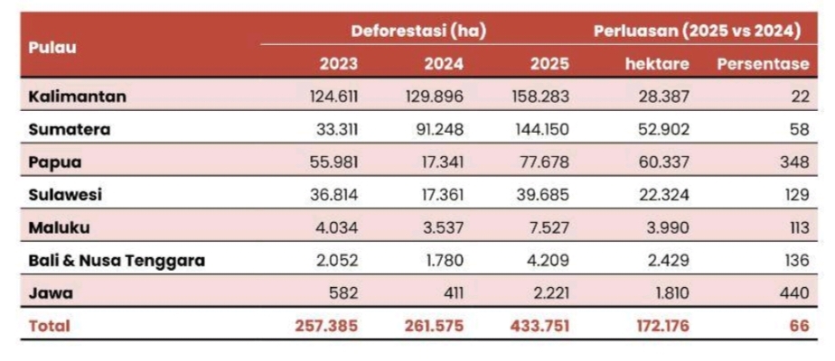 Di sisi lain, Sulawesi, Maluku, Bali-Nusa Tenggara, hingga Jawa juga mengalami peningkatan. Bahkan di Jawa, meskipun luas hutannya sudah terbatas, persentasenya sangat tinggi. Angka-angka tersebut menunjukkan bahwa tekanan terhadap hutan sudah terjadi hampir di seluruh wilayah Indonesia, tidak lagi terbatas di kawasan hutan besar saja.