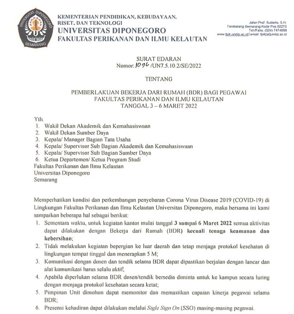 Warta Utama – Fakultas Perikanan dan Ilmu Kelautan (FPIK) Universitas Diponegoro kembali menerapkan sistem Bekerja Dari Rumah (BDR), sesuai dengan Surat Edaran (SE) Nomor 1096/UN7.5.10.2/SE/2022 tentang Pemberlakuan Bekerja dari Rumah (BDR) bagi Pegawai Fakultas Perikanan dan Ilmu Kelautan Tanggal 3 sampai 6 Maret 2022.