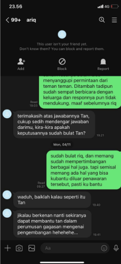 Sementara itu, Ganesha juga mengklarifikasi kepada awak Manunggal pada Sabtu, (14/12), bahwa dirinya memang sempat dihubungi oleh perantara dari tim Ariq melalui pesan teks untuk menanyakan waktu luang. Meski awalnya pesan tersebut tidak ia balas, pertemuan akhirnya terjadi di sebuah warung makan.