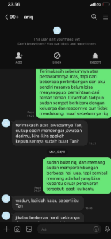 Bukti Chat Nathan dengan Ariq pada Senin, (4/11) melalui Line (Sumber: Dok. Pribadi)