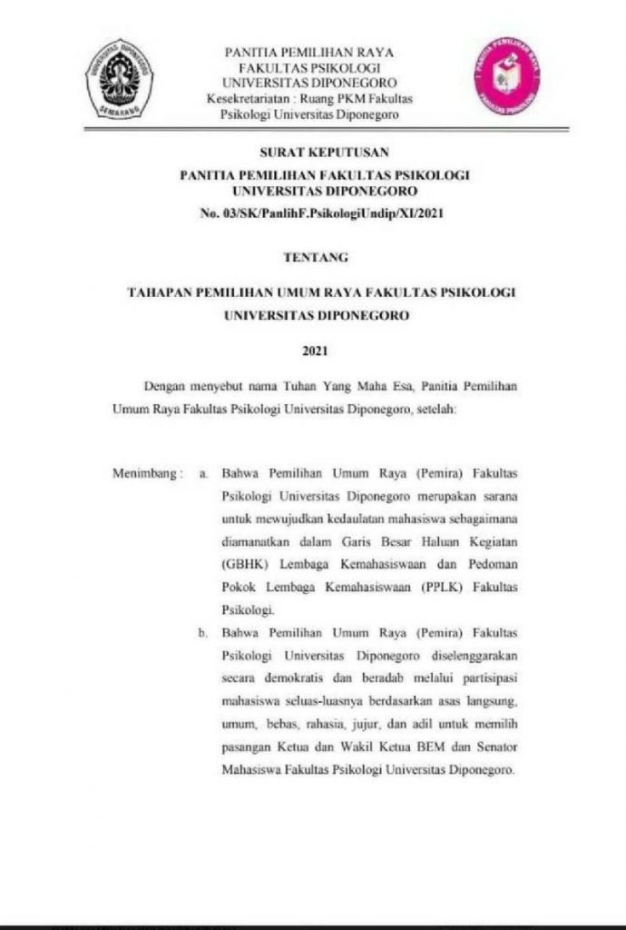 Artikel ini sebelumnya berjudul, “Tabrakan Timeline antara Pemira Undip dan Pemiltas, Panlih Psikologi Undur Waktu Pemungutan Suara.”