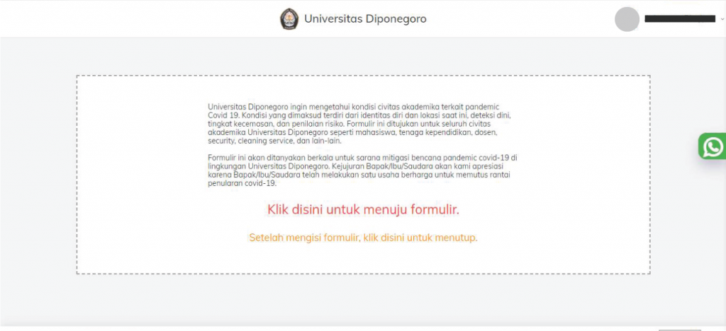 Formulir monitor civitas academica yang muncul di laman awal SSO Undip. (Sumber: Manunggal)