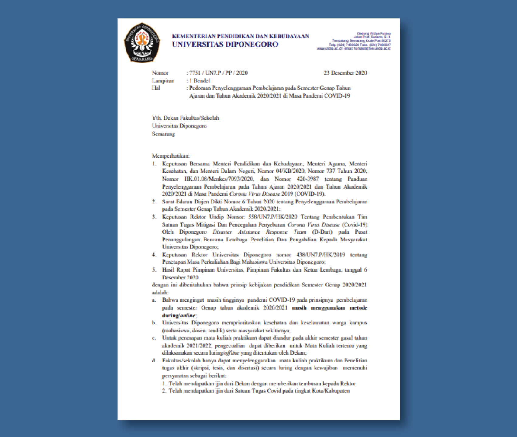 Warta Utama— Undip terbitkan pedoman terkait Penyelenggaraan Pembelajaran Semester Genap Tahun Ajaran dan Tahun Akademik 2020/2021 di Masa Pandemi Covid-19, Rabu (23/12) melalui website resminya.