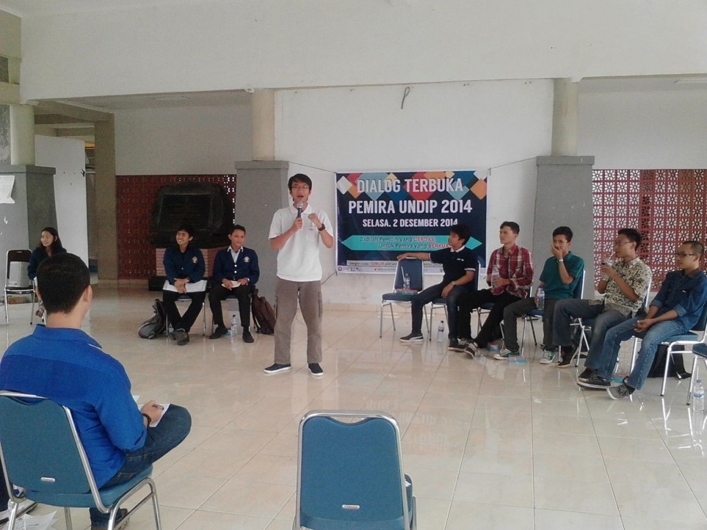 Presiden Partai Party Evolution Student (PES), Khanif Nasuha, menyampaikan visi dan misi partainya dalam Dialog Terbuka Pemira Undip 2014 di Student Centre Undip, Selasa (2/12). (Rifqi/Manunggal)