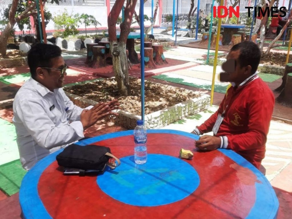Muhammad Adly (berbaju putih), seorang Konselor Adiksi ketika bercengkrama dengan seorang penyintas untuk dokumentasi IDN Times (Sumber: IDN Times)