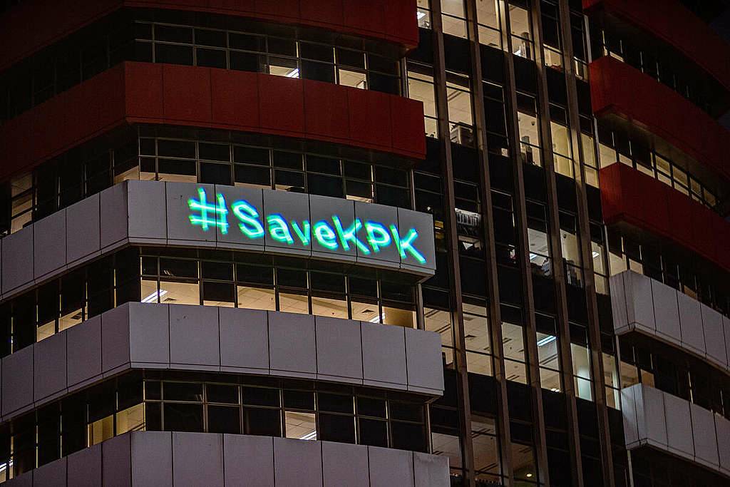 Aksi penembakan laser ke arah gedung KPK oleh Rebuild Indonesia Alliance sebagai bentuk kritik. (Sumber: Greenpeace.com)