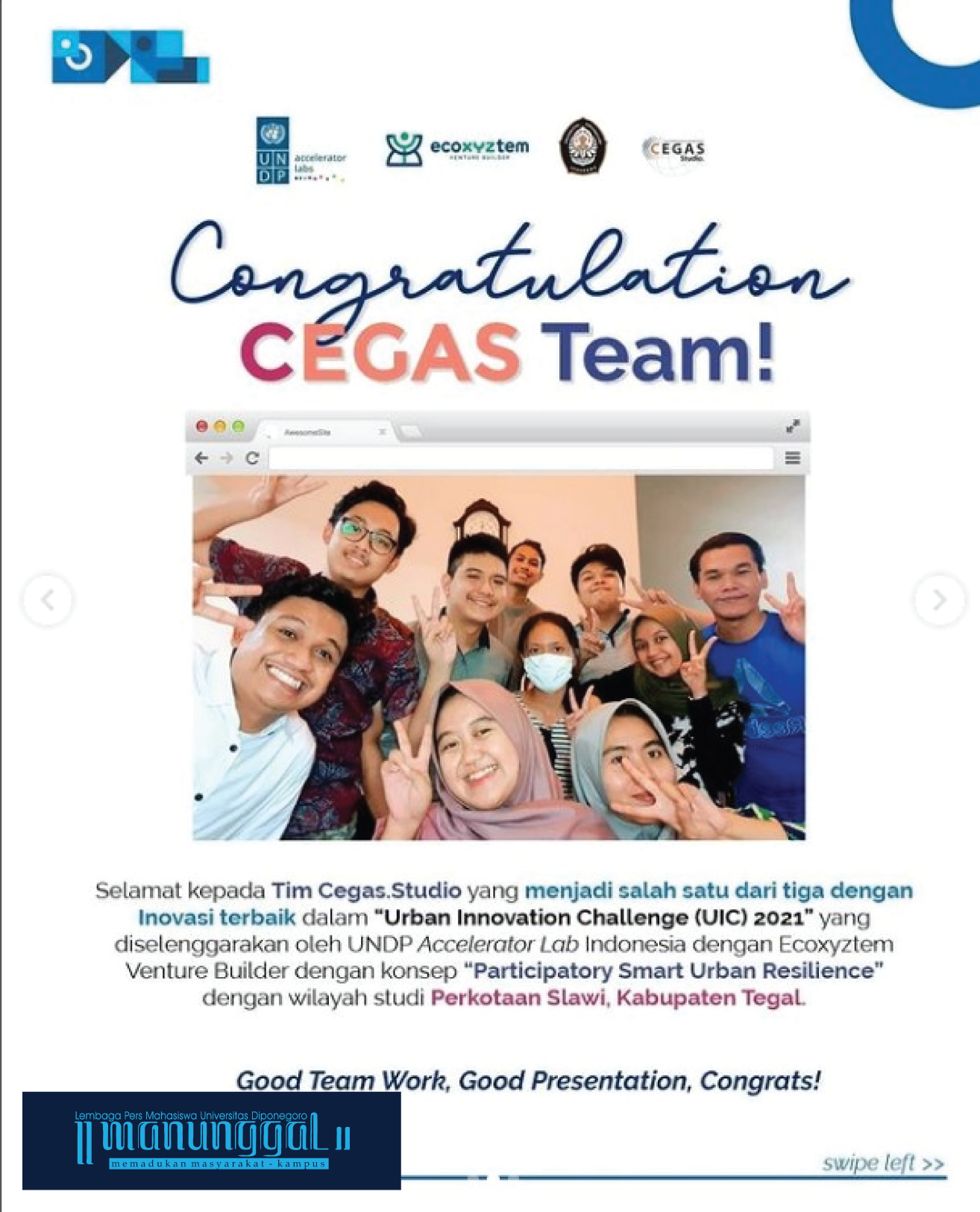 CEGAS studio menjadi salah satu tim yang turut berpartisipasi dalam Urban Innovation Challenge yang diadakan oleh UNDP Accelator Lab Indonesia dan Ecoxyztem. CEGAS (Center of Geomatics Application for Sustainable Development) berfokus pada perencanaan spasial menggunakan aplikasi geomatika. CEGAS studio beranggotakan mahasiswa UNDIP yang dibimbing oleh Prof. Dr. Rer. Nat. Imam Buchori, S.T dan Dr. Anang Wahyu Sejati S.T M.T sebagai advisor, berhasil masuk menjadi salah satu dari total 10 finalis menuju demo day. Demo day dilaksanakan pada 24 Desember 2021 di Artotel Thamrin, Jakarta. Tim CEGAS Studio yang diketuai Andika Wiratmaja dan terdiri dari 12 orang lainnya berhalangan hadir onsite sehingga mengikuti demo day secara online melalui Zoom.