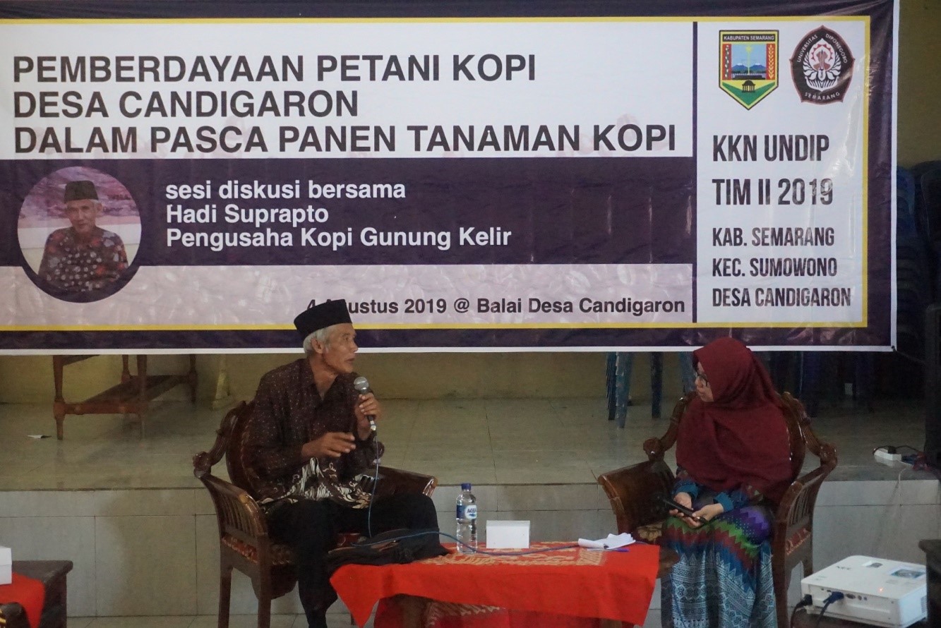 Semarang –  Tim II KKN Undip mengadakan kegiatan multidisiplin yang berlangsung di Balai Desa Candigaron. Acara yang berlangsung pada 4 Agustus 2019 ini bertujuan untuk memberdayakan petani kopi di Desa Candigaron melalui diskusi bersama Hadi Suprapto atau lebih akrab dipanggil Mbah Prapto, seorang pengusaha kopi dari daerah Jambu,  Ambarawa. Hadi Suprapto merupakan pengusaha kopi yang sudah memasarkan produknya hingga mancanegara seperti Swedia, Korea dan Prancis.