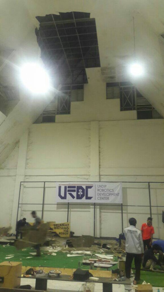 ManunggalCybernews– Senin (20/11) Gedung Serba Guna (GSG) Undip yang habis digunakan oleh Undip Robotics Development Center (URDC) untuk latihan rutin dikejutkan oleh jatuhnya plafon GSG secara tiba-tiba. Alfin Luqmanul Hakim, Ketua Electrical Workshop (EWS), menjelaskan kejadian tersebut terjadi sekitar pukul 23.00 WIB. “Kejadian itu terjadi setelah selesai latihan. Untungnya peserta sudah pada pulang dan hanya tersisa beberapa orang aja yang lagi duduk-duduk ngobrolin agenda dan ngobrol santai,” ungkapnya kepada tim cybernews LPM Manunggal pada Rabu (22/11) ketika ditemui di GSG Undip.
