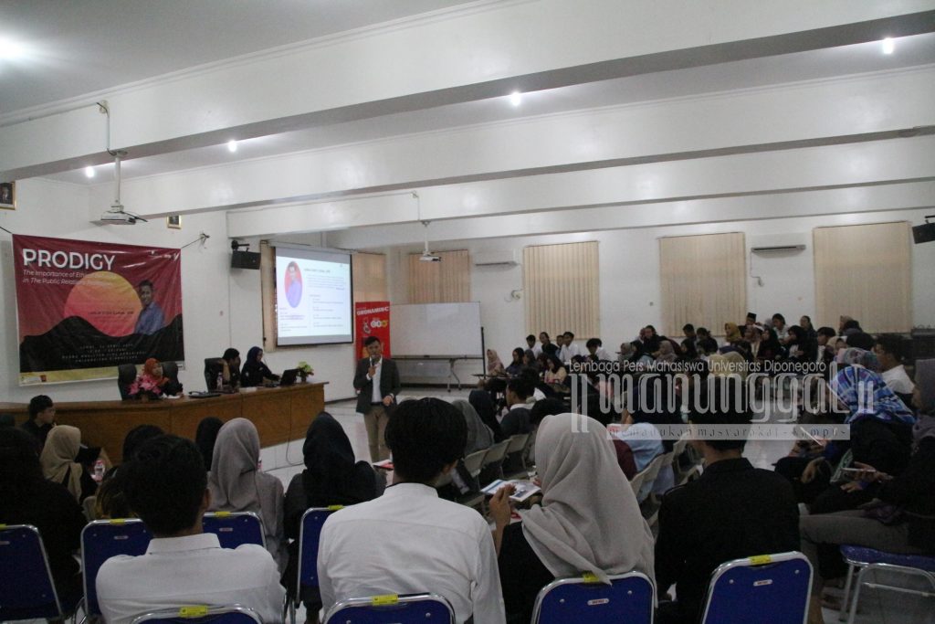 Corporate Communication PT. Amerta Indah Otsuka, Laibun Sobri menyampaikan materi dalam kegiatan PRODIGY (Public Relations of Diponegoro University) yang diselenggarakan oleh Himpunan Mahasiswa Program Studi (HMPS) D3 Hubungan Masyarakat Undip pada Jumat (26/4), bertempat di Ruang Sidang Magister Ilmu Komunikasi Undip, Pleburan. (Erlin/Manunggal) (Photo by Tita/Manunggal)