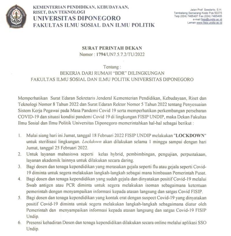 Warta Utama – Melalui Surat Perintah Dekan Nomor 1794/UN7.5.7.2/TU/2022 tentang Bekerja dari Rumah “BDR” di Lingkungan Fakultas Ilmu Sosial dan Ilmu Politik (FISIP) Universitas Diponegoro, karantina wilayah atau lockdown di area FISIP kembali diberlakukan.