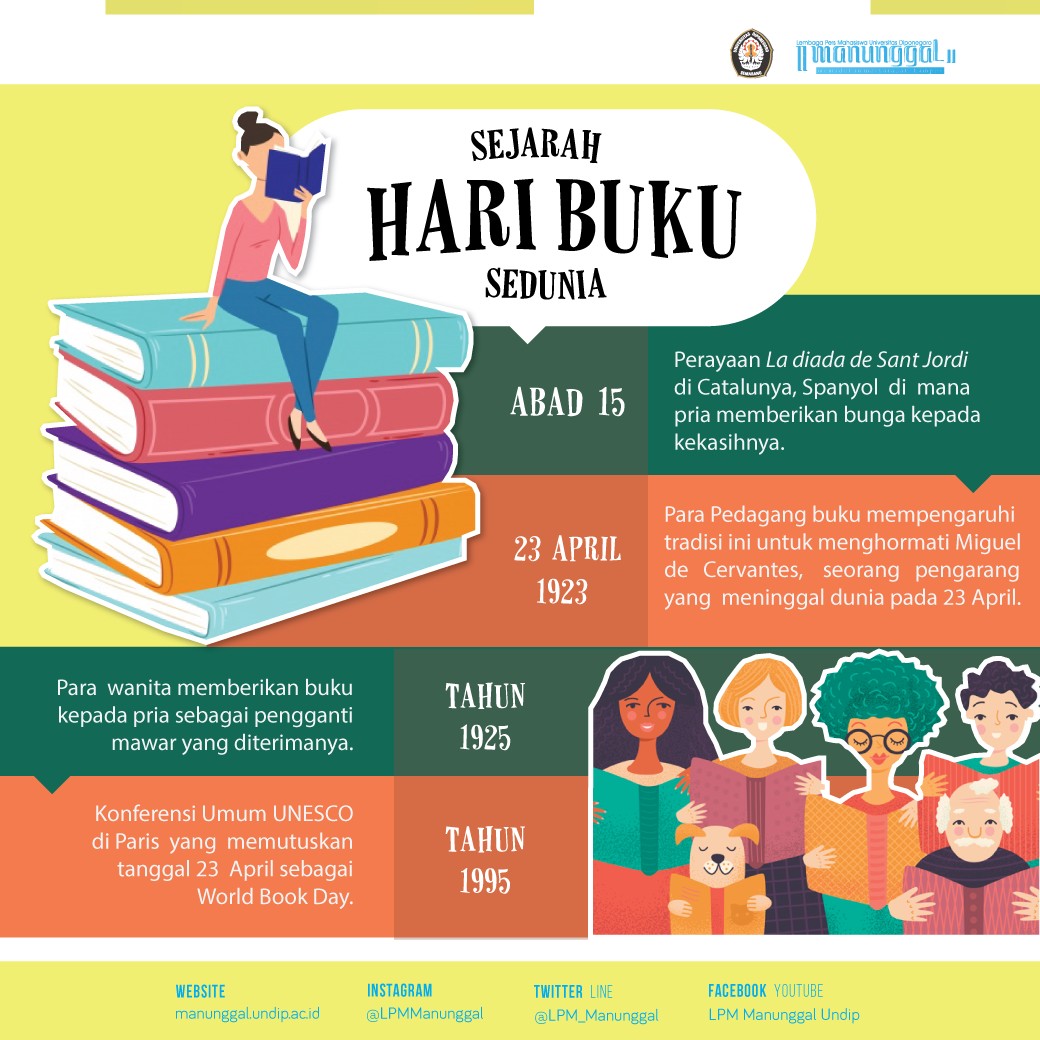 Pada tahun 1995 UNESCO menyelenggarakan Konferensi Umum di Paris yang menetapkan bahwa tanggal 23 April sebagai peringatan World Book Day berdasarkan perayaan La Diada de Sant Jordi di Catalunya. Pada tanggal 23 April beberapa pengarang terkenal seperti Shakespeare, Cervantes, Inca Garcilaso de la Vega, dan Josep Pla meninggal dunia. Selain meninggalnya beberapa pengarang terkenal, pada tanggal tersebut juga merupakan tanggal kelahiran beberapa pengarang seperti Maurice Druon, Vladimir Nabokov, Manuel Meija Vallejo, dan Halldor Laxness.