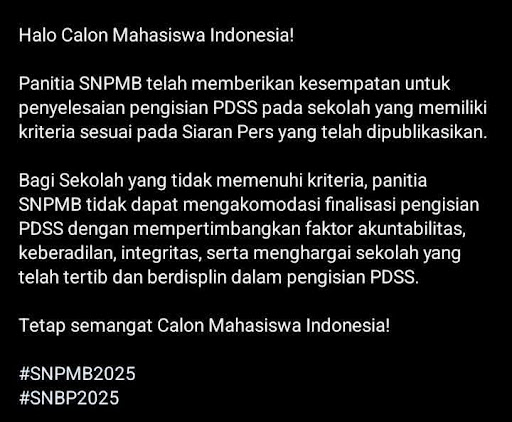 Ketua Pelaksana SNPMB 2025, Prof. Tjitjik Sri Tjahjandarie, PhD sempat menyatakan bahwa finalisasi PDSS benar-benar ditutup pada Jumat (31/1).