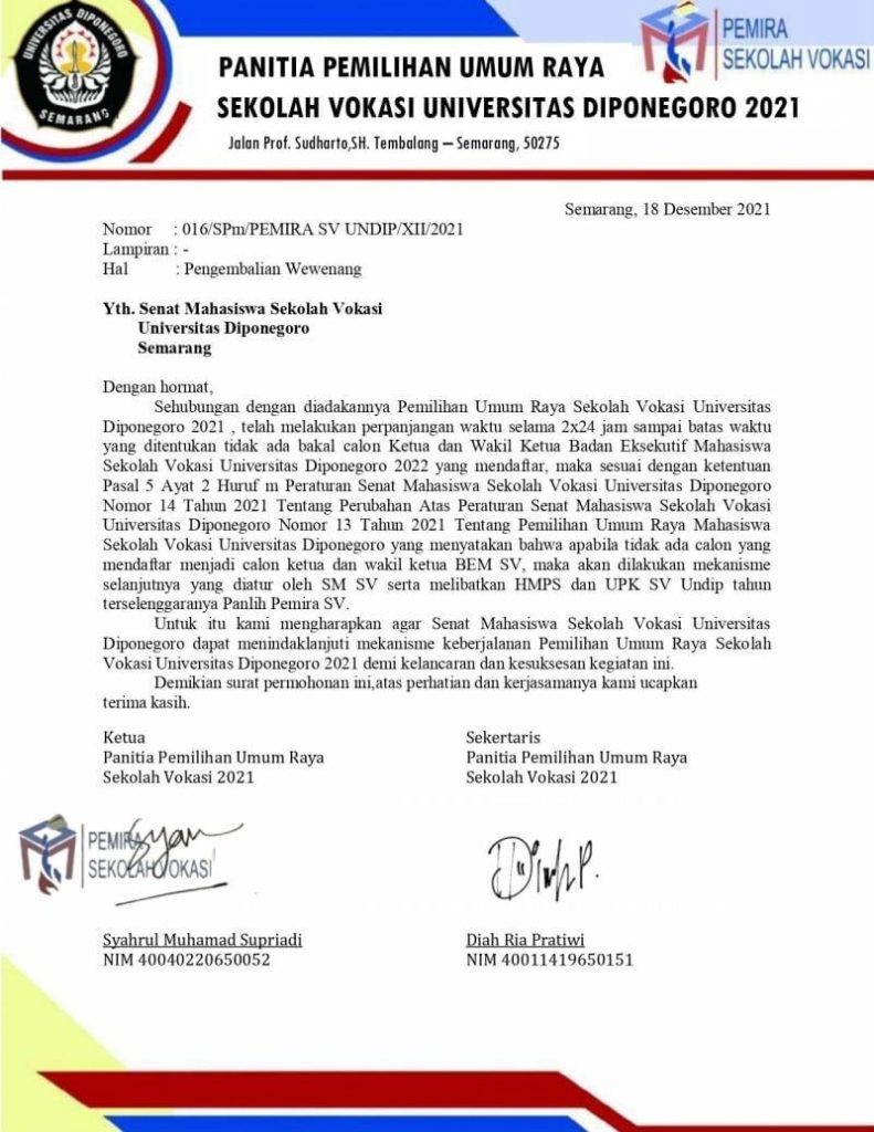 Warta Utama – Meski telah diperpanjang, pendaftaran Calon Ketua dan Wakil Ketua BEM SV 2022 yang dibuka sejak 13-17 Desember 2021 sepi peminat. Hal ini ditindaklanjuti Panitia Pemilihan (Panlih) dengan mengembalikan wewenang pemilihan kepada Senat Mahasiswa Sekolah Vokasi (SM SV) untuk dilakukan mekanisme selanjutnya.