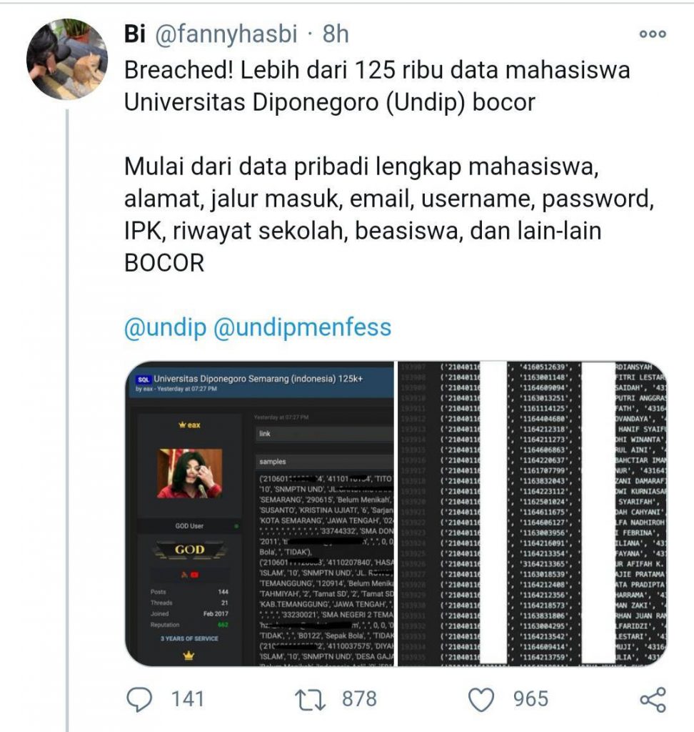 Selasa (5/1) lalu, forum mahasiswa digemparkan dengan cuitan sebuah akun Twitter @fannyhasbi yang mengatakan bahwa telah terjadi kebocoran 125 ribu data pribadi mahasiswa Undip. Data tersebut berupa nama lengkap, NIM, alamat, jalur masuk, email, username, password, IPK, riwayat sekolah, beasiswa, dan lain-lain yang telah terverifikasi di setiap akun SSO milik mahasiswa aktif.