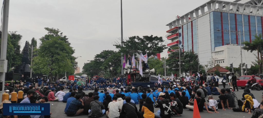 Massa aksi mendengarkan orasi politik di depan Gedung Gubernur Jawa Tengah, Kamis (31/3) (Sumber: Manunggal)