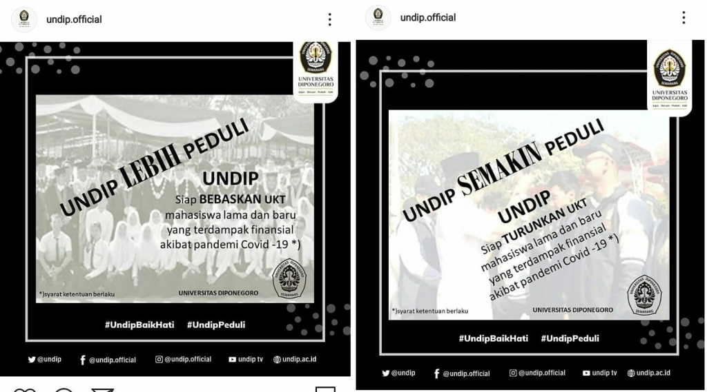 Dua unggahan akun instagram undip.official terkait UKT sebagai tanggapan #UndipKokJahatSih, Sabtu (1/5). (Sumber : instagram/undip.official)