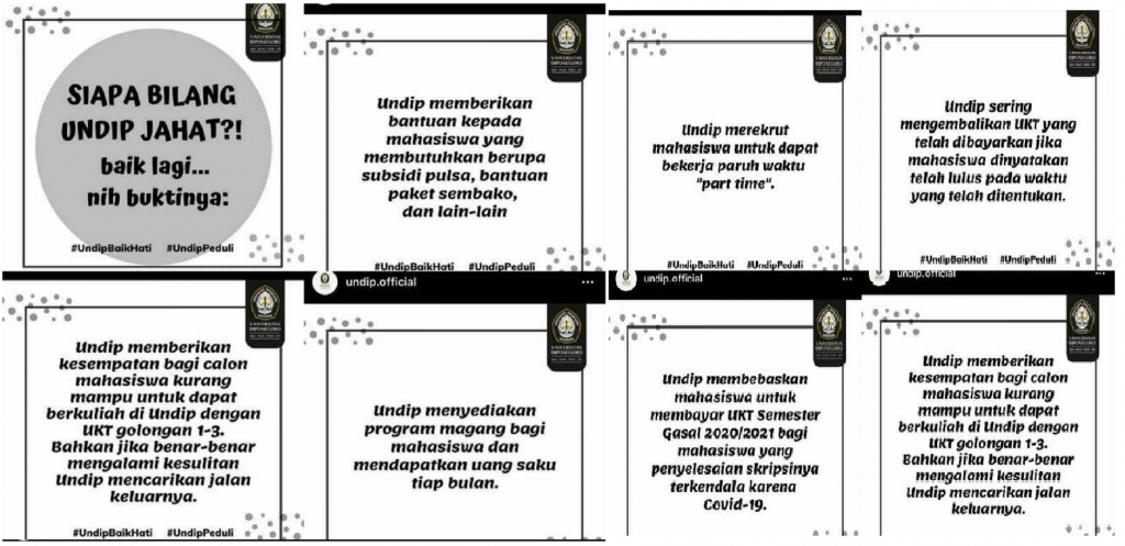 Adanya keputusan tersebut, membuat ramainya protes atas kenaikan UKT yang berujung viralnya tagar #UndipKokJahatSih. Terdapat satu fenomena yang menarik, yaitu munculnya unggahan tandingan dari Instagram undip.official. Unggahan tersebut membawa tagar #UndipBaikHati dan #UndipPeduli serta mencantumkan delapan poin yang seakan ingin membuktikan bahwa tuduhan tagar #UndipKokJahatSih tidak benar.