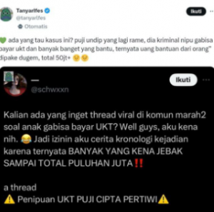 Kasus ini semakin viral setelah akun X @tanyarlfes ikut membahasnya, menyoroti bagaimana Puji telah menyalahgunakan bantuan dari orang-orang yang bermaksud baik. Akun tersebut menulis, “ada yang tahu kasus ini? Puji Undip yang lagi viral, dia ternyata seorang penipu yang mengaku tidak mampu membayar UKT dan banyak mendapatkan bantuan. Uangnya malah dipakai untuk dugem, totalnya lebih dari 50 juta.”