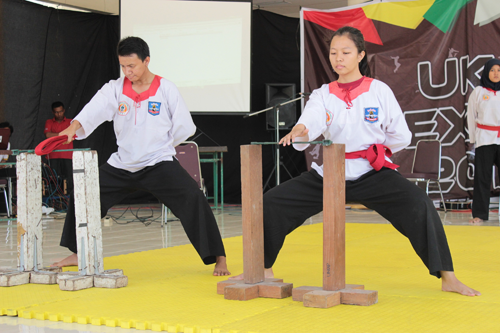 Dua pesilat dari UKM Merpati Putih sedang bersiap membelah besi dengan sabuk dan tangan kosong dalam UKM Expo di Student Centre Undip, Rabu (8/10). (Kalista/Manunggal)