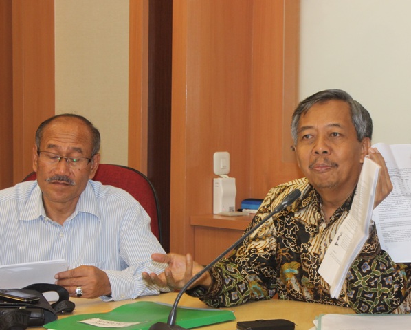 Prof Sudharto Pranata Hadi, MES, PhD (kanan) dan Dr Warsito SU (kiri) menjelaskan kesiapan Undip menyambut PIMNas ke-27 dalam konferensi pers di Ruang Sidang Rektorat Undip, Rabu (20/8). (Ririn/Manunggal)