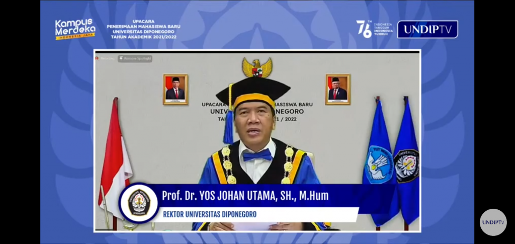 Prof. Dr. Yos Johan Utama, SH., M. Hum pada sesi sambutan rektor di Upacara Penerimaan Mahasiswa Baru (PMB) TA 2021/2022 Universitas Diponegoro.